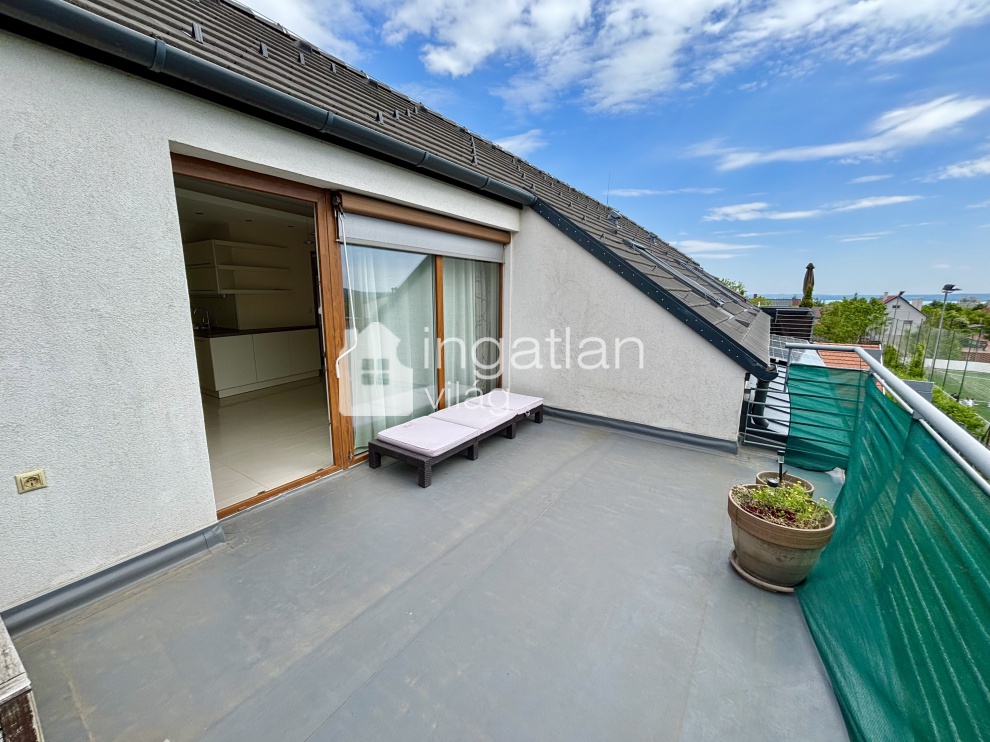 A nappalihoz 15 nm nagyságú, nyugati tájolású erkély kapcsolódik, ahonnan PANORÁMA nyílik a TIHANYI-FÉLSZIGETRE.