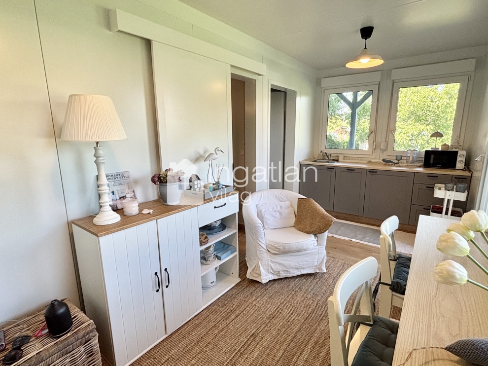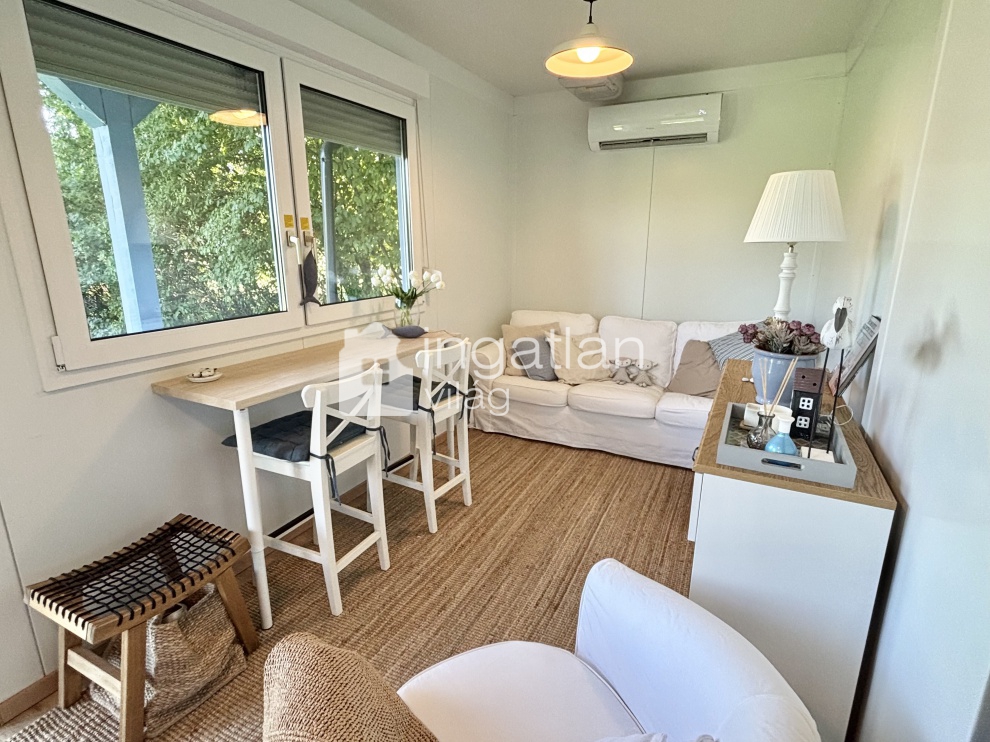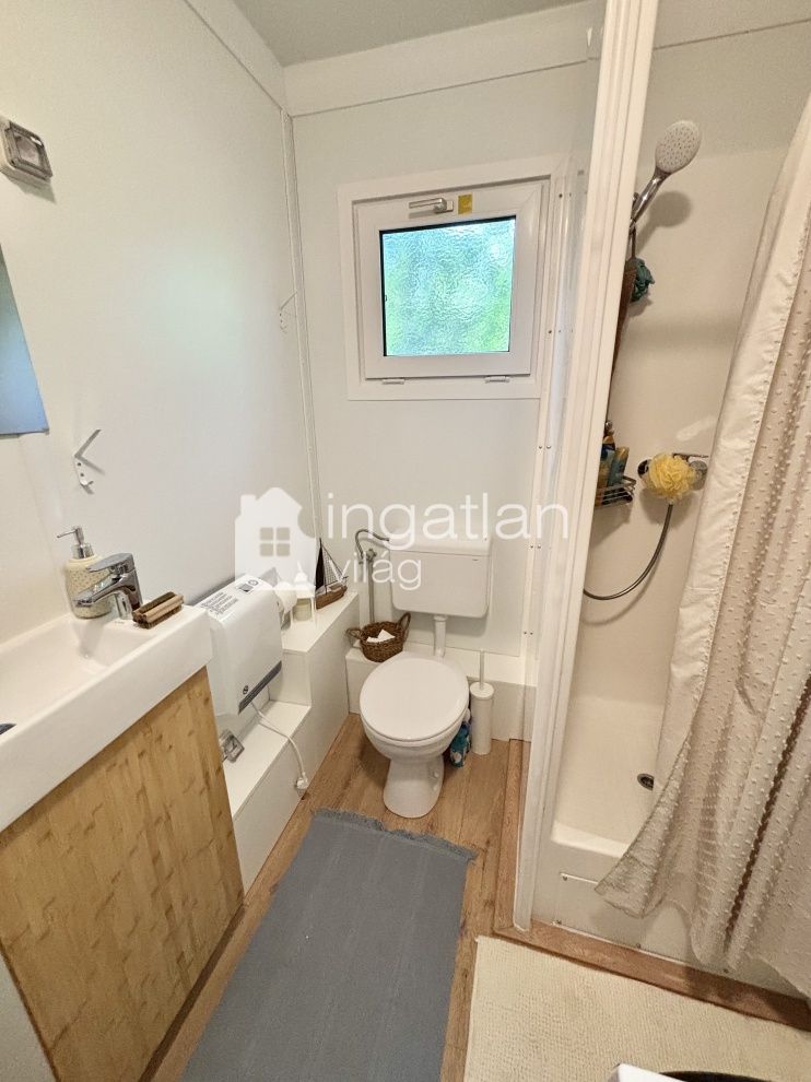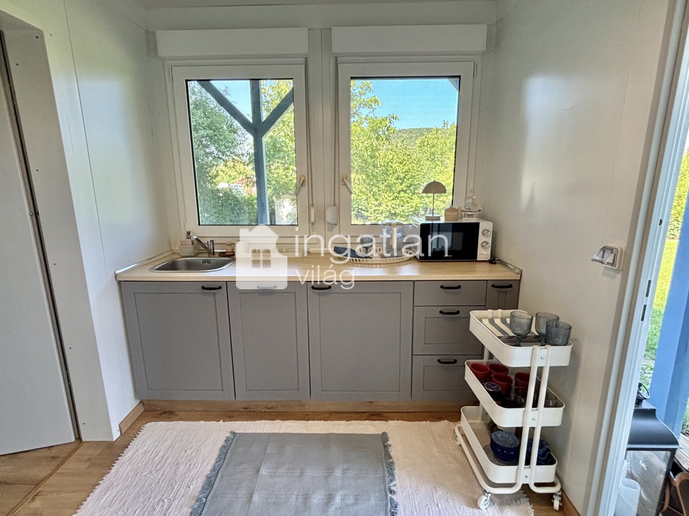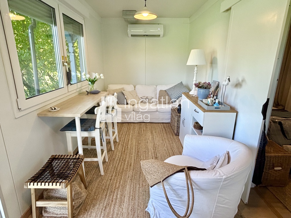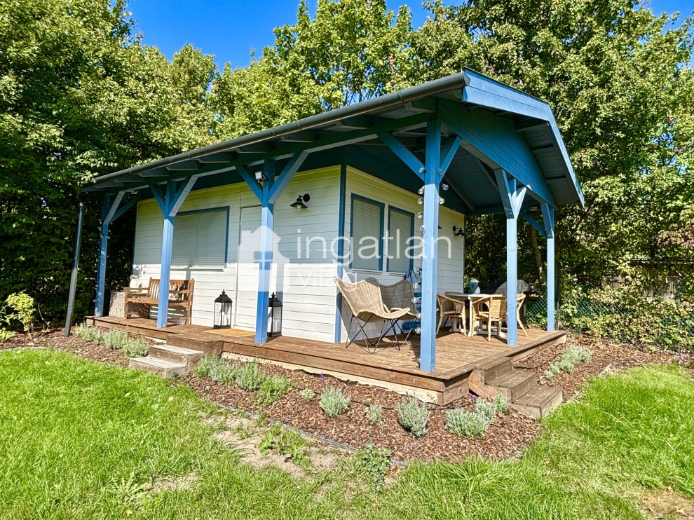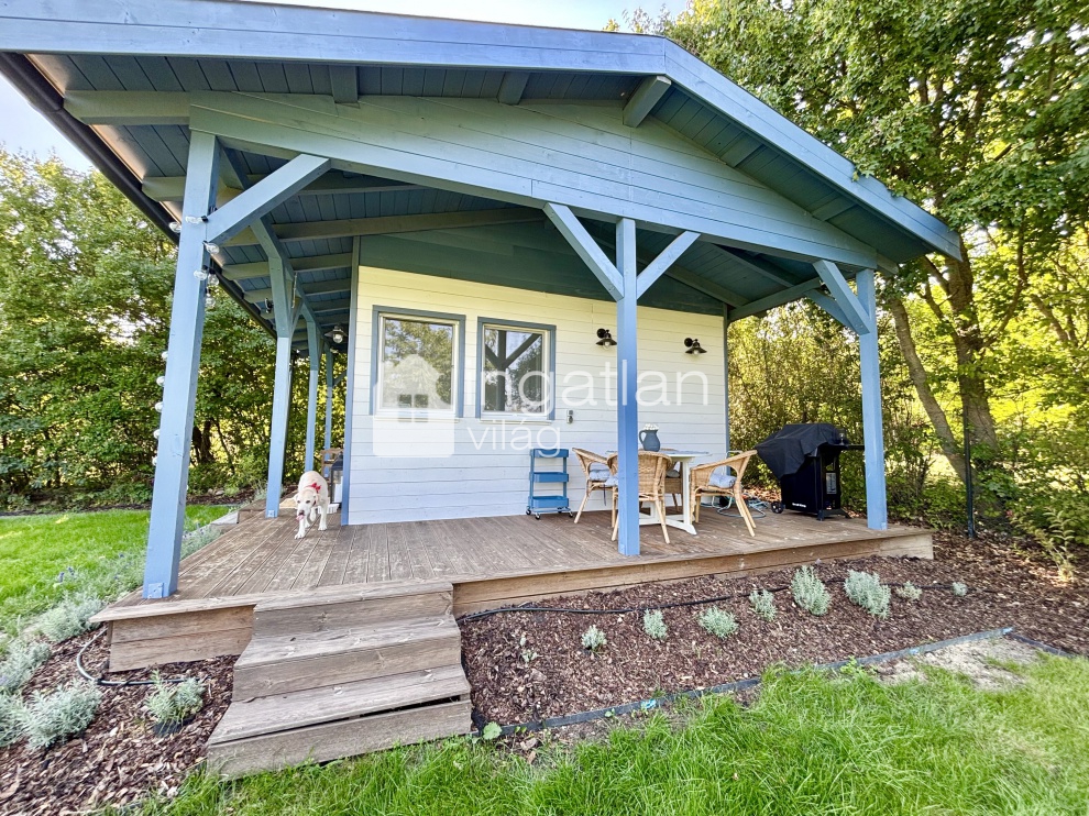A telken egy 30 nm nagyságú TÉLIESÍTETT, KÖNNYŰSZERKEZETES ingatlan található, melyben konyha, nappali, hálószoba és fürdőszoba kapott helyett. A körülötte elhelyezkedő FEDETT TERASZ 18 nm nagyságú.