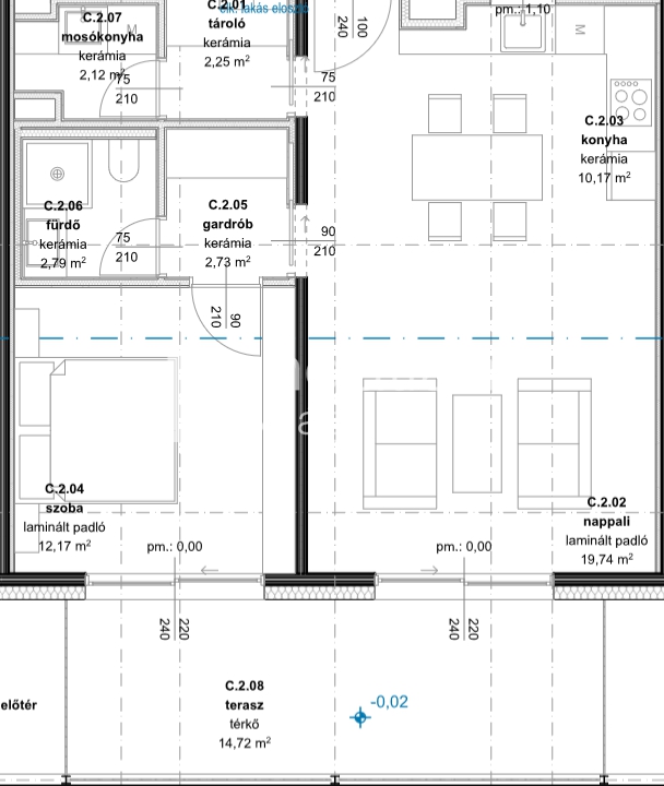 Az FÖLDSZINTEN elhelyezkedő lakás bruttó alapterülete 55 nm, melyen amerikai konyhás tágas nappali, hálószoba, TUSOLÓS fürdőszoba, gardrób, mosókonyha és tároló került kialakításra. A nappali és a hálószoba is TERASZKAPCSOLATOS, mely 15 nm nagyságú.
