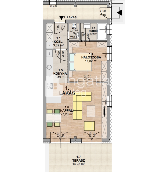 Az lakás alapterülete 53 nm, melyen előszoba, konyha, vendég WC, nappali - 27 nm - , hálószoba - 12 nm - és fürdőszoba kapott helyet. A nappali előtt 14 nm nagyságú BURKOLT TERASZ található, mely előtt DISZNÖVÉNYEKKEL és AUTOMATA ÖNTÖZŐRENDSZERREL ellátott KERTRÉSZ helyezkedik el.