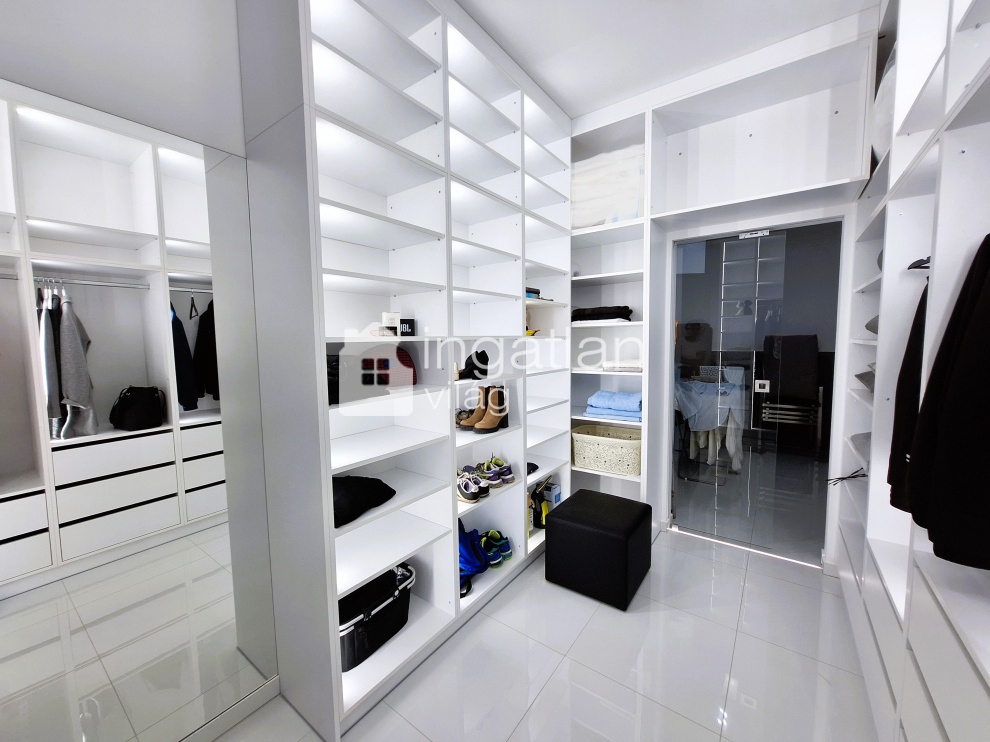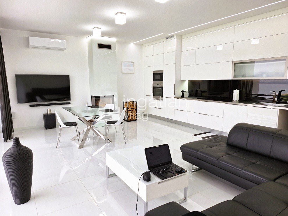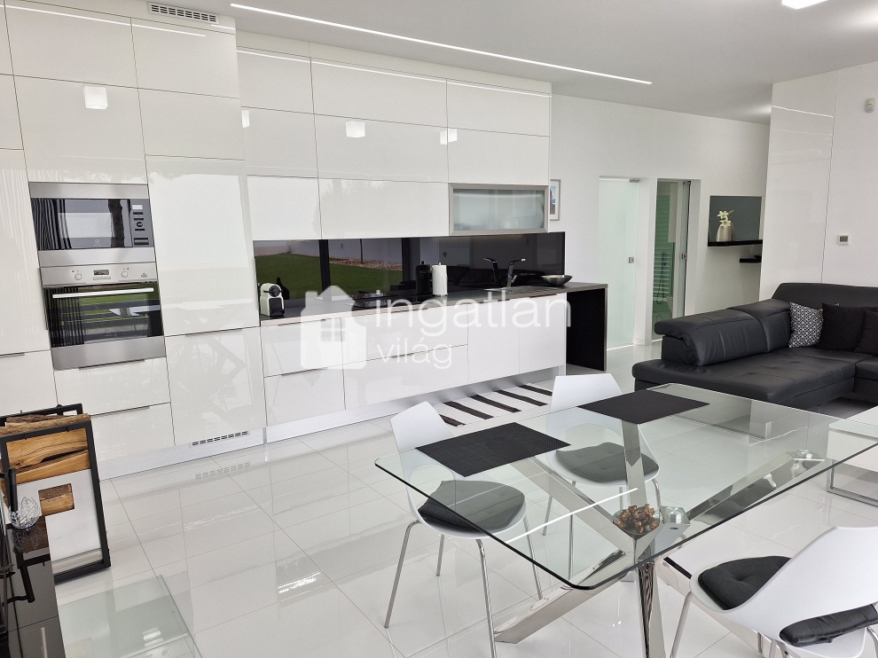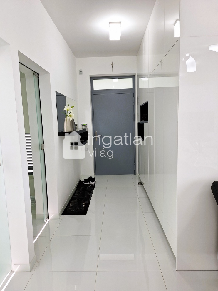 A világos, nagy belmagasságú házban egylégterű nappali-konyha-étkező, hálószoba, fürdőszoba tusolóval, közlekedő, gardróbszoba és mosókonyha, gépészettel lett kialakítva.