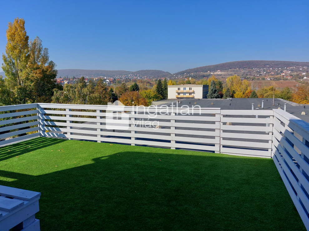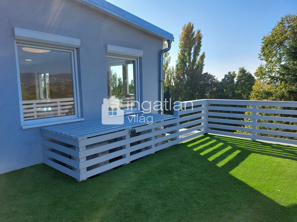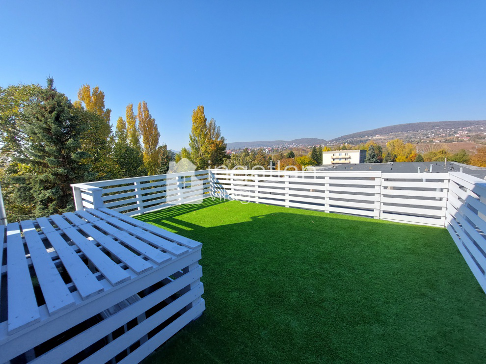 A diszkrét, saját használatú teraszról gyönyörű kilátás tárul elénk a Balaton-felvidék páratlan szépségű lankáira.
