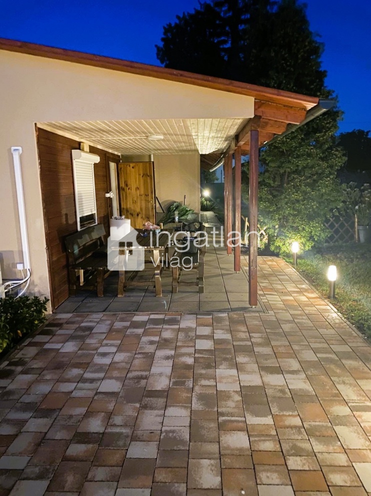 A bejárat előtt nagyobb méretű fedett terasz van kiépítve.