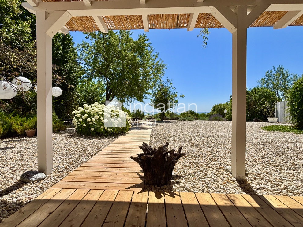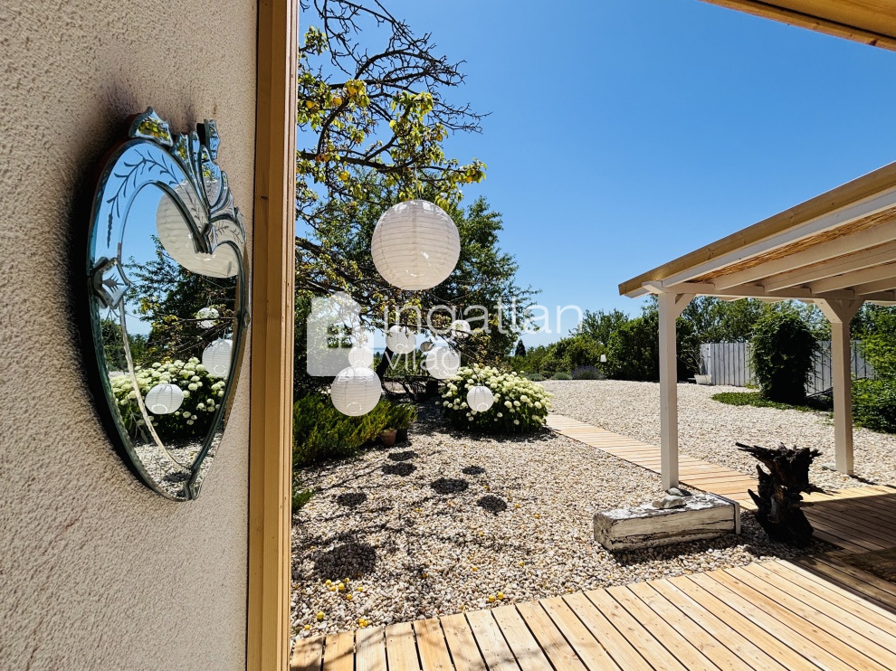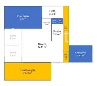A nappali előtt 28 nm nagyságú PANORÁMÁS TERASZ található, mely PERGOLÁVAL fedett.