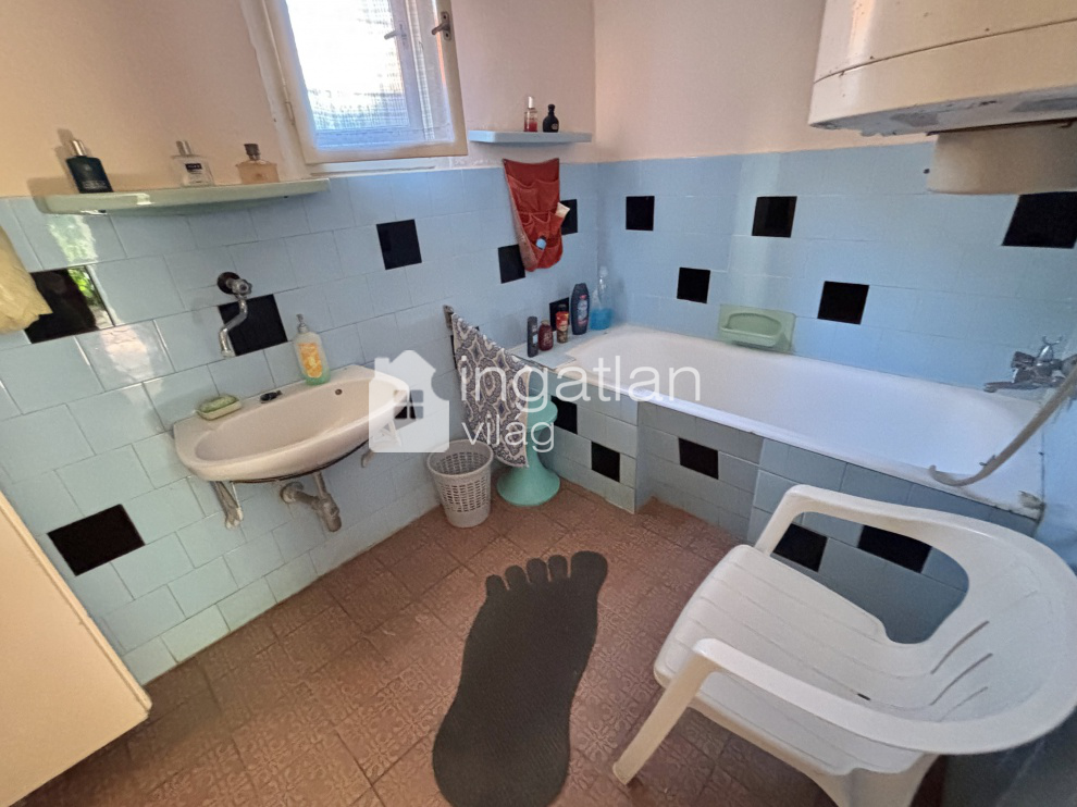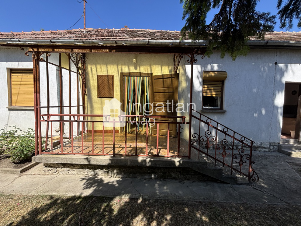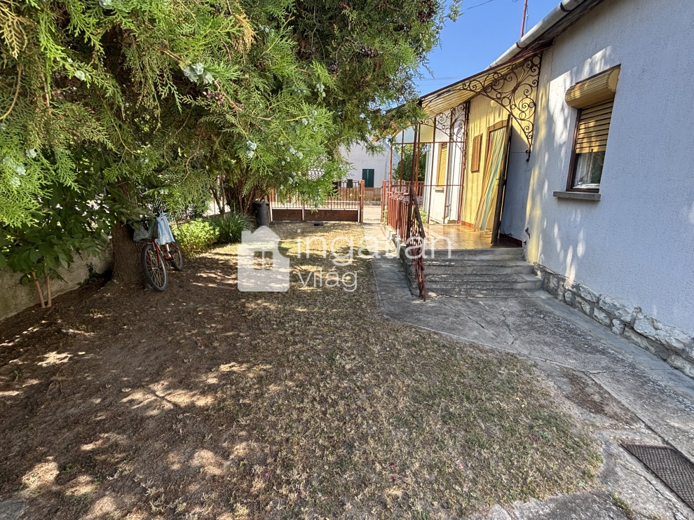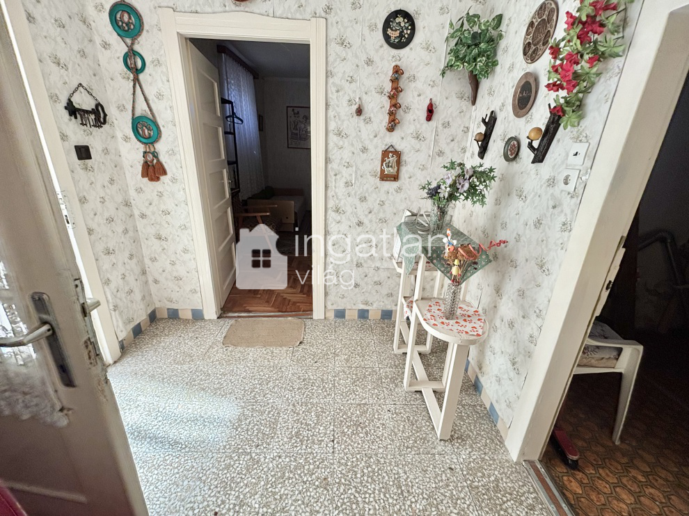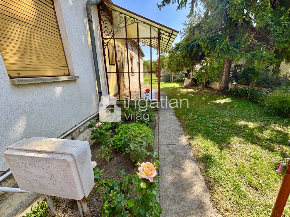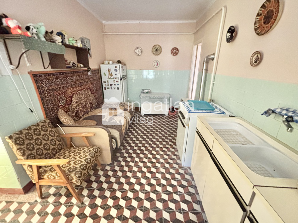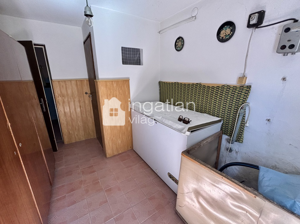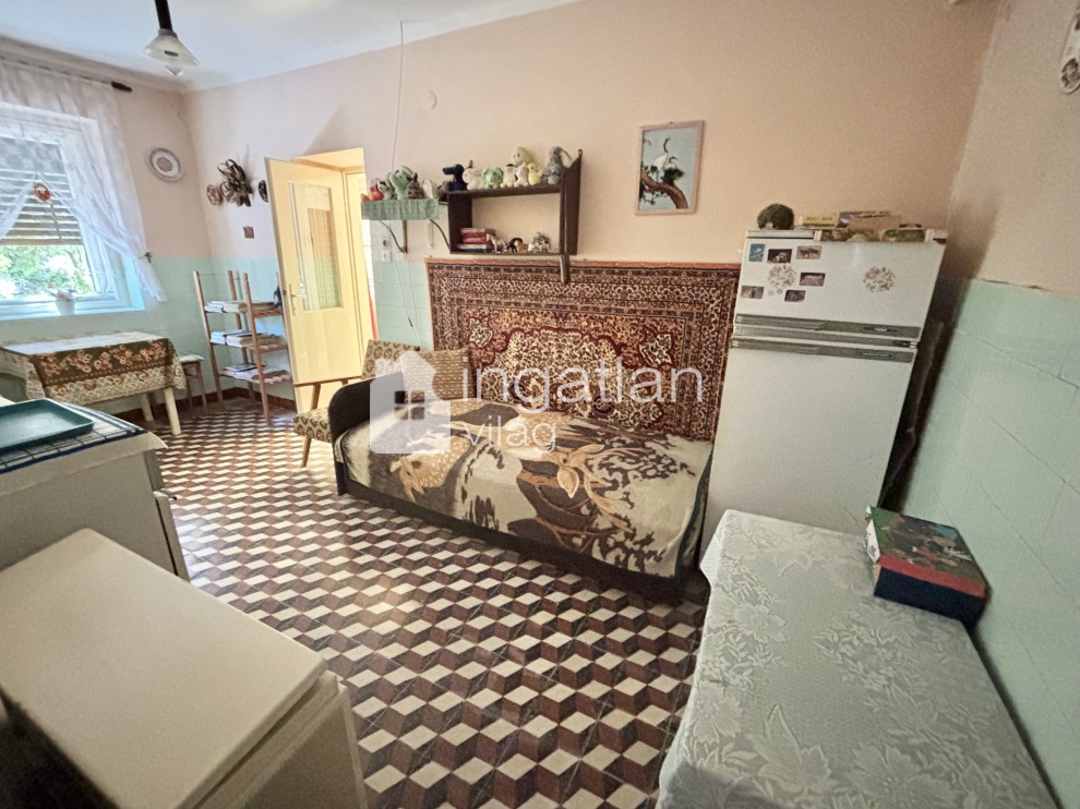 Az 1600 nm nagyságú, hosszúkás TÉGLALAP formájú telek utcafrontján helyezkedik el a 61 nm lakóterületű ingatlan. A házban előtér, nappali - 21,3 nm - konyha, kamra, fürdőszoba és egy fél szoba kapott helyet.