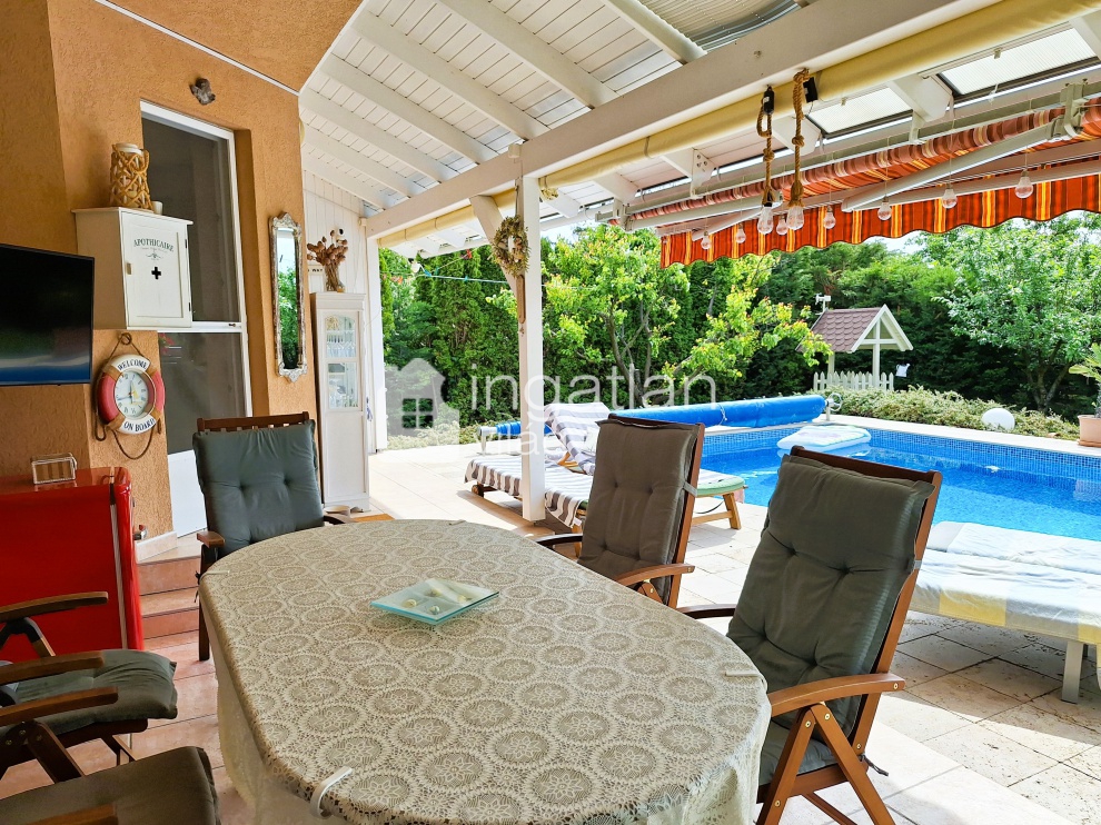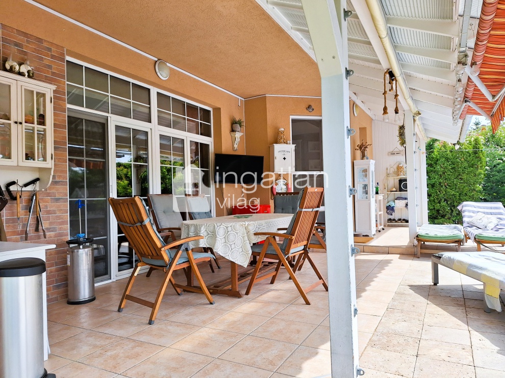 Déli tájolású 25 nm nagyságú, félig fedett, hangulatos hátsó terasz közvetlenül a medence partján, a mobil oldalfalaknak köszönhetően téli kertként is tökéletesen használható.