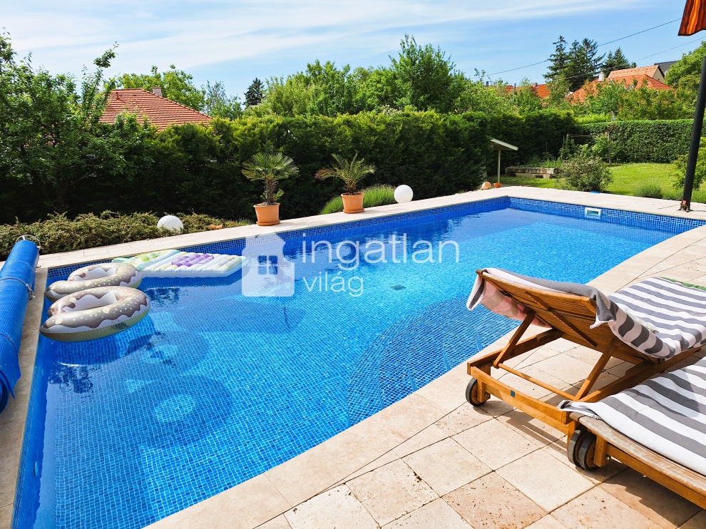 Egyedi méretű, nagyjából 7*4 méteres fűthető medence, kiépített lépcsővel, pihenővel, takaró ponyva fedéssel.
