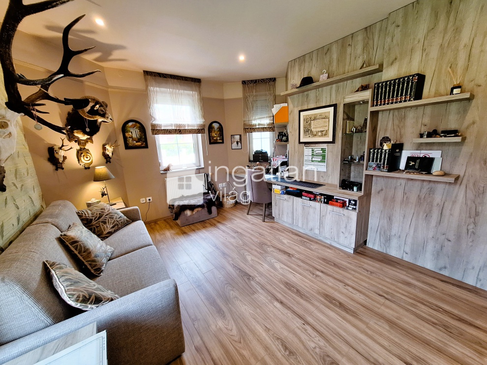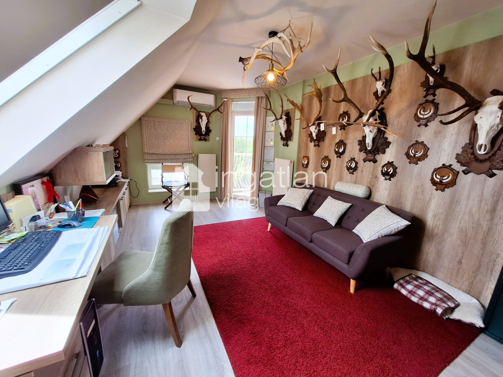 A 2000-es évek elején épült lakóház alsó szintjén tágas, egylégterű nappali-konyha-étkező, dolgozószoba, szeparált fürdőszoba, WC, előtér és lépcsőfeljáró lett kialakítva.